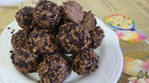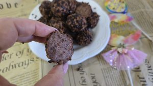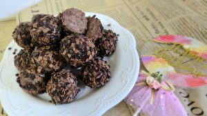 Bomboane festive de casa sunt extrem de bune, aromate, delicioase! Perfecte pentru zilele de nastere, pentru platouri festive sau pentru un desert in familie. Am rostogolit bomboanele prin mici ornamente de ciocolata pe care le-am luat de aici, insa se pot folosi orice ornamente micute aveti la indemana. Pentru aceste bomboane avem nevoie de blat de tort pe care sa-l sfaramam si sa-l amestecam cu crema.