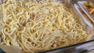 Macaroane sau spaghete cu branza – deliciul simplu si gustos al copilariei mele. Cand prepara mama macaroane cu branza era ziua mea preferata. Acum nu am gasit sa cumpar macaroane, paste astemanatoare cu spaghetele, dar mai groase. Spaghetele sunt un inlocuitor perfect al macaroanelor. Iar branza sarata de vaca, branza de la Napolact am folosit eu, indulcita cu zahar, aromata cu esente si asezonata cu stafide este potrivita pentru acest tip de paste gatite la cuptor.