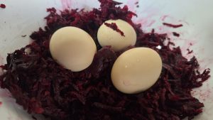 3.Punem ouale fierbinti direct in sfecla razuita si le acoperim bine cu sfecla. Le lasam asa minim 4-5 ore. Din cand in cand le mai intoarcem, le verificam sa vedem cum ies si le lasam cat de mult dorim in sfecla rosie. Eu le-am lasat aprox. 6 ore.