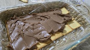 5.Adaugam crema si apoi un alt strat de biscuiti trecuti 1-2 secunde prin laptele caldut.