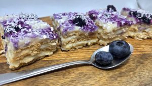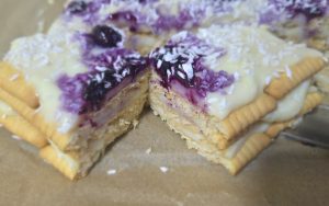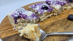 3.Intre timp punem 50 ml lapte intr-un bol. Tapetam o tava de yenna cu hartie de copt si adaugam un strat de biscuiti trecuti 2-3 secunde prin lapte. Adaugam un strat de crema calda, adaugam alt strat de biscuiti, crema si tot asa. Mie mi-au iesit 3 straturi de biscuiti si 3 straturi de crema. Am finalizat prajitura cu un strat de crema. Din loc in loc am adaugat dulceata de afine si am presarat nuca de cocos deasupra prajiturii. Am dat prajitura la rece 1 ora.