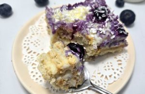 Prajitura cu biscuiti si crema de vanilie – una dintre acele prajituri simple, dar de care nu te poti satura. Cum au gustat din ea, ai mei au zis in cor „Mmmm” si au mai ramas doar cateva portii pentru mai tarziu. Am asamblat prajitura in 5-7 de minute. Mai mult a durat prepararea cremei – aproximativ 10-13 minute. Eu i-am adaugat si putina dulceata de afine, insa puteti adauga ori de care aveti la indemana.