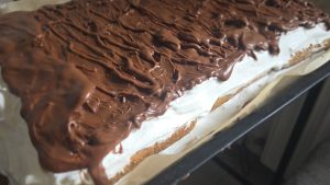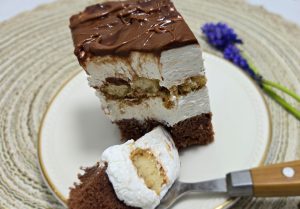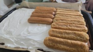 4.Adaugam un strat de piscoturi insiropate 1-2 secunde in cafea ( 100 ml cafea neindulcita), adaugam restul de crema si finalizam prajitura cu un strat de crema de ciocolata (Finetti) pe care o topim 10-12 secunde in cuptorul cu microunde.
