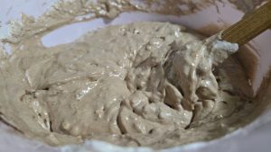 5.Intre timp preparam crema: mixam spuma albusurile cu zaharul. Adaugam nuca macinata, faina, Finetti, esenta si cacao si le incorporam bine. Aceasta nu este o crema foarte groasa.