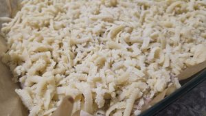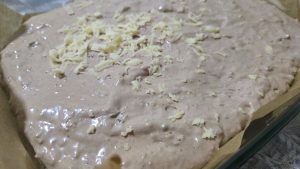 7.Adaugam stratul de crema si deasupra lui razuim pe razatoarea cu ochiuri mari partea de aluat mai mica.