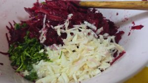 2.Dam sfecla rosie pe razatoarea cu ochiuri mari. La fel si telina. Le punem intr-un bol incapator.