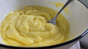 4.Pentru maioneza folosim galbenusurile de la 2 oua fierte si galbenusurile de la 2 oua crude. Le punem impreuna intr-un bol si le amestecam bine. Adaugam in fir subtire uleiul si amestecam. In functie de cat de mult ulei folosim, vom avea mai multa sau mai putina maioneza. Cand aproximam ca avem suficienta maioneza pentru legumele noastre, ne oprim, nu mai adaugam ulei.