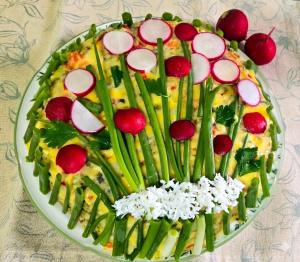 Amestecam legumele cu maioneza si punem salata pe 2 platouri. Ornam dupa preferinta. Eu am folosit ceapa verde, ridichi si albus de ou.
