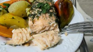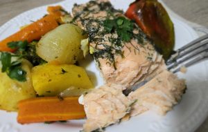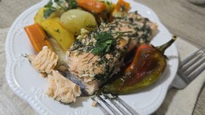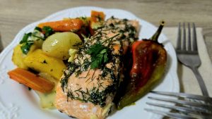 - Servire. Putem servi somonul alaturi de legume gatite la cuptor, de salate sau diverse piureuri. Eu am gatit legume la cuptor dupa reteta aceasta.