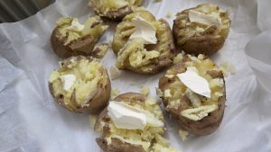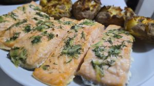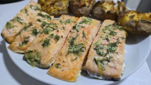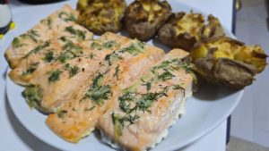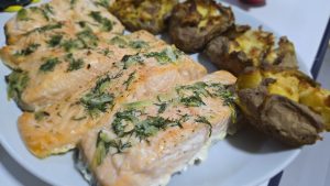 Noi am servit somonul cu cartofi preparati la cuptor. Am fiert cartofii cu coaja doar pana cand furculita i-a strapuns cu usurinta. Am pus cartofii in tava tapetata cu hartie de copt si i-am presat cu fundul unui pahar. Nu i-am zdrobit prea tare. Am adaugat cate un cubulet de unt, sare si piper deasupra fiecarui cartof si i-am rumeni la cuptor.