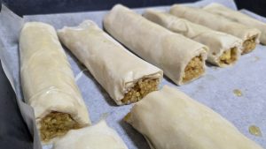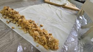 5.Punem 3 foi de placinta pe blat, insa avem grija sa ungem fiecare foaie cu ulei. Punem mere caramelizate intr-o parte a foilor, adaugam nuca din abundenta si rulam cat de strans putem. Taiem ruloul in doua si il punem in tava tapetata cu hartie de copt. Procedam in acelasi fel pana cand terminam foile de placinta. Ungem strudelele cu ulei.