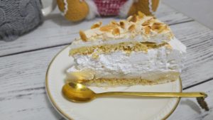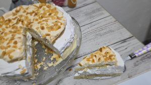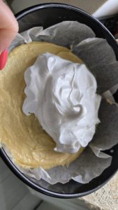7. Asamblam tortul. Punem un blat de tort pe un platou cu partea cu bezea in jos. Adaugam toata crema, toata frisca si finalizam cu celalalt blat de tort avand grija ca partea cu bezeaua sa fie in sus.