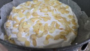 - Mixam albusurile cu un praf de sare timp de 3-4 minute, apoi adaugam zaharul si zeama de lamaie si le mixam spuma. Impartim bezeaua in doua parti si o adaugam deasupra celor 2 blaturi necoapte puse anterior in tavi. Presaram fulgi de migdale si coacem cele 2 blaturi deodata in cuptorul preincalzit la 165 de grade. Coacem blaturile timp de 25-28 de minute pana cand devin aurii.